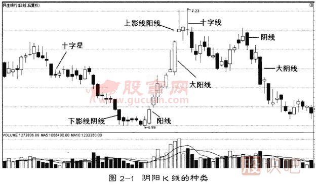 單一K線分陽K線和陰K線。陽K線即收盤價(jià)高于開盤價(jià)的K線;陰K線即收盤價(jià)低于開盤價(jià)的K線。(如圖2-1)
