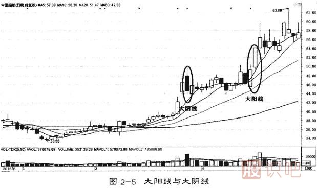 大陽線與大陰線的K線實(shí)體較中陽線與中陰線更長。較低價(jià)開盤后一路上升,并以全天較高價(jià)收盤,就可以有較短的上下影線存在,但在整體感覺上其較短的上下影線可忽略,陽線實(shí)體巨大,稱為大陽線(圖2一5)