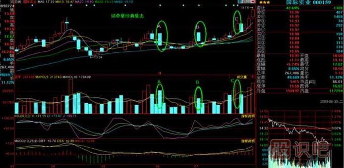 技術(shù)特征:試盤量經(jīng)典量態(tài),試盤量發(fā)生在兩個位置,一處為循環(huán)低位區(qū),股價為準(zhǔn)備上漲前的暖身運(yùn)動,稱為低位試盤量;另一處發(fā)生在股價漲升一段時間之后,股價處于高位整理軋尚未明顯走弱,呈現(xiàn)成交量能逐漸增加現(xiàn)象,稱為高位試單量。試盤量發(fā)生之后往往伴隨攻擊型量能的啟動。正如:小荷才露尖尖角的試盤量發(fā)生后,隨后攻擊量的到來,必將催生股價映日荷花別樣紅。下面討論低位試盤量。發(fā)生在2次試盤量之后常為變盤點(diǎn)。試盤量如下圖國際實(shí)業(yè)(000159)標(biāo)示A、B、C處。