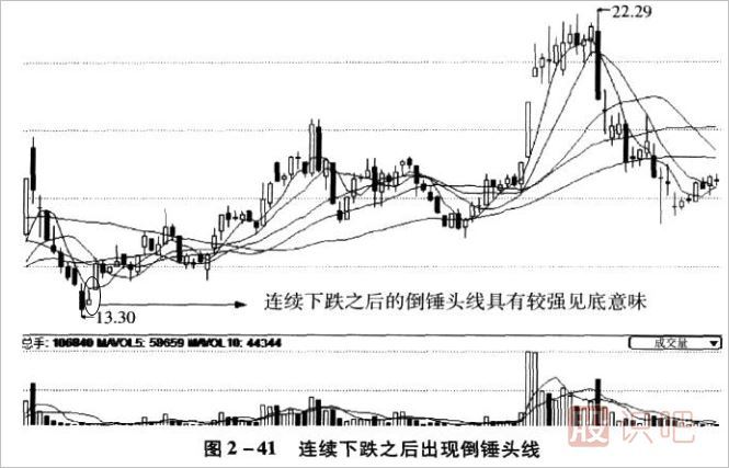如果倒錘頭線出現(xiàn)在股價大幅下跌之后,往往是股價見底的信號,此時空方雖然仍占據(jù)主導,但盤中多頭主力已經(jīng)開始嘗試反攻。一旦見底則意味著被大多數(shù)投資者認同,股價止跌并由降轉(zhuǎn)升的概率就比較大,如圖2-41所示。