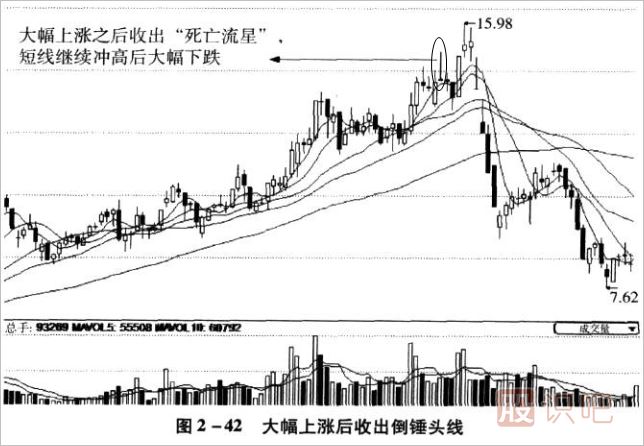 若倒錘頭線出現(xiàn)在股價大幅上漲之后,那么就要特別小心了。這跟上一節(jié)所說的錘頭線相似,上一節(jié)的錘頭線被稱為“斷頭錘”,這一節(jié)倒過來的錘頭線,書面的叫法為“射擊之星”,筆者稱它為“死亡流星”。