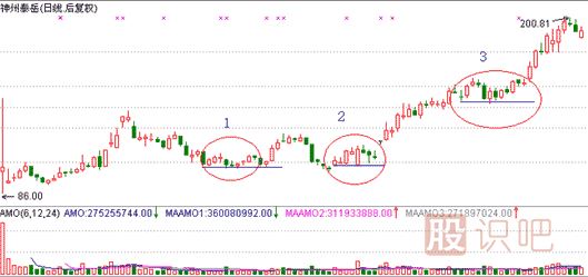 神州泰岳(300002)在上市后出現(xiàn)了三次平底結構,圖中1和2構造了股價啟動前的雙底結構,3是波段性底部。從該股走勢看,該股多采用平底橫盤整理,這正是超級強勢股的特征,大家仔細觀察一下,這三處K線成交量都是萎縮的,而且后面都跟著一根大陽線,特別是2處后面跟的是一根接近一字板的漲停K線,這些都符合實戰(zhàn)要點。