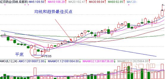 如上圖所示,在某一下降趨勢中,股票K線下端,即最低價在某一水平區(qū)域平齊, 這意味著股價在此水平位置連續(xù)獲得支撐,此區(qū)域很可能成為股價調整的階段性底部區(qū)域。這里需要注意的是,平底形態(tài)一般多出現(xiàn)在股票走勢的波段性調整底部,所謂平底也不要求底部100%平齊,只要求K線最低價大體在同一水平位置即可。同樣的穩(wěn)健的投資者在出現(xiàn)平底之后也不可貿然入場,只有均線最佳買點和趨勢最佳買點出現(xiàn)后才適合入場掃貨。