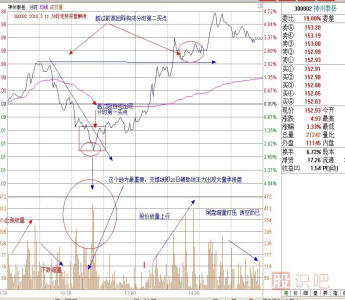 技術分析不是那么簡單,不是讀讀波浪理論、搞搞江恩理論,然后再弄幾個技術指標就算技術高手了,能在第一時間對股價走勢進行精準打擊,就必須對分時的量能結構和具體的微細的盤口細節(jié)具備相當?shù)恼J知和解讀能力,下面是我今日(2010.3.11)實盤講解時對300002分時盤口的解讀,這是如何在第一時間對買點進行精準撲捉的實盤運用,希望大家都好好看看,很多東西會在以后操盤中會周而復始的出現(xiàn),我們來看下面這幅圖: