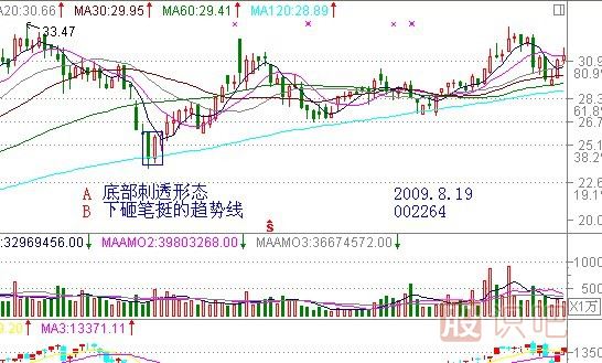 刺透形態(tài),又稱斬回線形態(tài)、旭日烘底、刨根問底,叫法挺多,本來想用刨根問底來命名,后來想想炒股是一門嚴謹?shù)目茖W,和趙本山的小品不能混為一談,我們還是用個嚴肅的名字。
