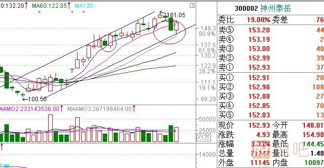 對刺透形態(tài)的運用不僅限于長期底部,而且適用于股價的調(diào)整階段,在底部形態(tài)(一)啟明星篇中說過300002神州太岳,那時股價近160元,建議大家調(diào)整到140元左右進行低吸,今天機會就來了。