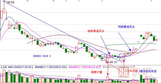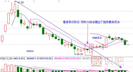 均線:吞沒形態(tài)出現(xiàn)后,均線系統(tǒng)配合出現(xiàn)金叉或者死叉,效果也能夠得到更好的確認(rèn)。