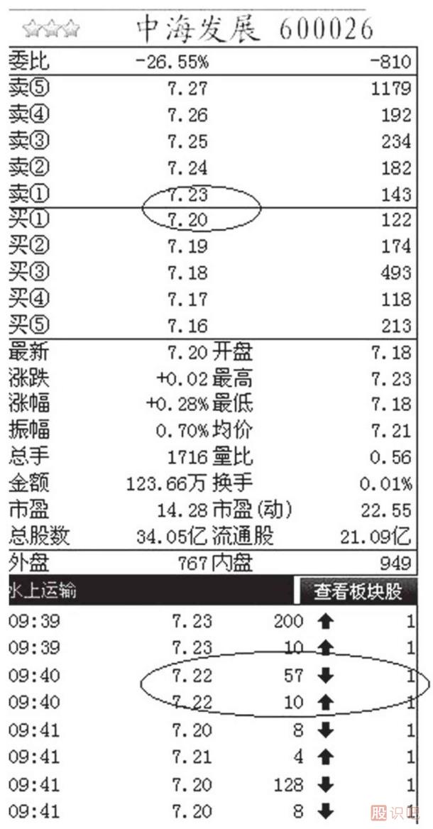 圖3-41就是中海發(fā)展(600026)在2011年11月11日星期五下午9:46時的盤口。該股買①到買⑤的價格為7.16?7.20元,賣①到賣⑤的價格分別為7.23?7.27元。但是,可以在上圖的盤口中明顯地看出,該股票在9:40的時候分別出現(xiàn)了57手和10手以7.22元成交的買盤和賣盤,這就是隱性買賣盤。