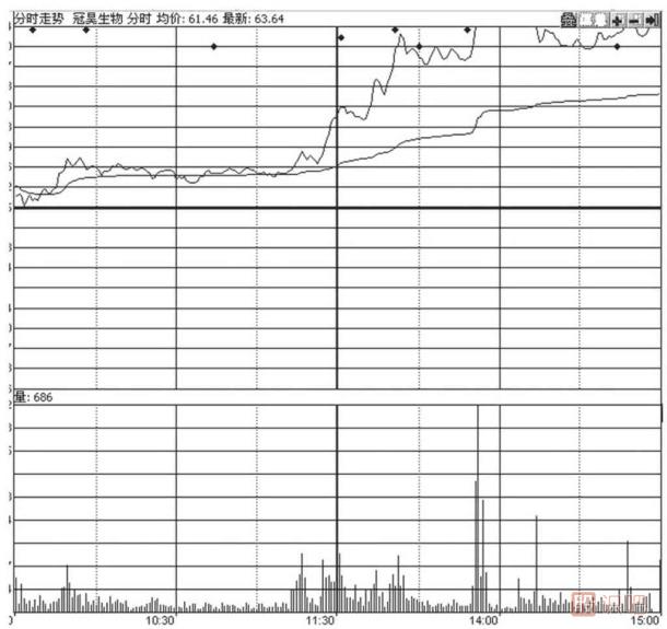 在股價已有一定漲幅后,瞬間以幾筆大單將股價筆直拉升至漲停(如圖3-11)。此為弱主力的投機性拉升,減輕拋壓,同時也可以減少跟風盤,以利后續(xù)拉升。