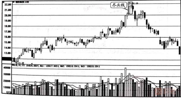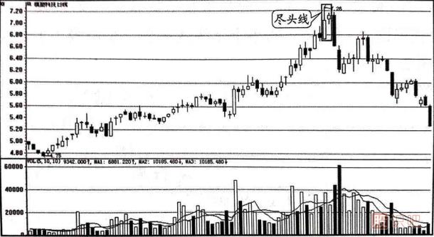 盡頭線是一種頂部轉(zhuǎn)勢的信號。在行情的上漲趨勢中,一般都認為這個趨勢會繼續(xù)運行下去,但是在一根陽線的長上影線右方,卻出現(xiàn)了一根完全涵蓋在上影線范圍內(nèi)的短十字線或小陽、小陰線,則預示著股價將要轉(zhuǎn)勢下跌。 頂部盡頭線中第二根K線越小,則轉(zhuǎn)勢的信號越強烈。 標準的盡頭線出現(xiàn)的機會并不多,而大多數(shù)情況下出現(xiàn)的都是不太標準的盡頭線,這種不太標準的盡頭線所發(fā)出的股價轉(zhuǎn)向信號對投資者同樣有相當大的參考價值。 只要是盡頭線,不論形態(tài)是否標準,投資者都要密切加以關(guān)注。 在漲勢中出現(xiàn)盡頭線,不應再盲目看多,可在股價下跌時及時賣出股票。