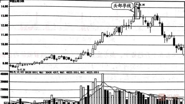 如圖1-34所示的是華意壓縮(000404)的日k線走勢圖。該股從前期低點7.31元開始震蕩攀升,在圖中的方框內(nèi)形成了頭部孕線的走勢。 第一天是一根帶上下影線的大陽線,還創(chuàng)出了此波上升的最高價14.35元,第二天股價低開,全天在賣盤的拋壓下股價走低,到收盤時形成了一根帶上下影線的小陰線,其實體和下影線被前一根大陽線的實體全部覆蓋。 由于在股價大幅上漲96%后出現(xiàn)的頭部孕線,表明股價上漲動力不足,可能向下回落。 雖然不一定馬上就會下跌,但投資者應(yīng)以資金安全為第一原則,只要次日股價低開低走或平開低走,就應(yīng)該考慮賣出離場。