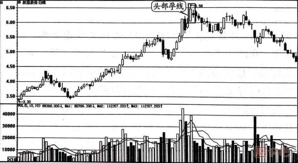 頭部孕線由兩根K線組成,第一根K線在高位收出一根大陽線或中陽線,第二天股價大幅低開,其K線實體完全被包含在前一天的大陽線或中陽線之中(上下影線可以不包括在內(nèi)),如圖1-33所示。接下來由股識吧來跟妳議多根K線頭部孕線賣出,相信大家讀完自然心中有數(shù)。