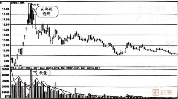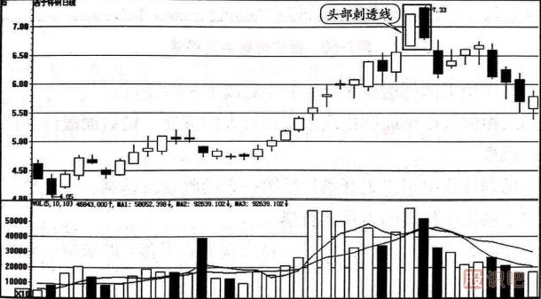 (3)在頭部刺透線出現(xiàn)后,股價一旦出現(xiàn)重心下移并跌破第一根陰線的開盤價就是果斷賣出的信號。