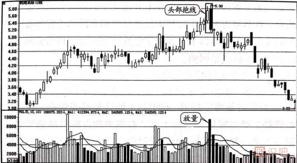 頭部抱線由兩根K線組成,第一根K線在高位收出一根陽線,第二根K線大幅高開后,在大成交量的配合下返身向下,以低于前一根K線的最低價收盤。從圖形上看,第二根K線將前一根K線完全吞沒(可以不包括前一根K線的上下影線),如圖1-27所示。接下來由股識吧來跟您說多根K線頭部抱線賣出,搞不懂的來了解一下呀。