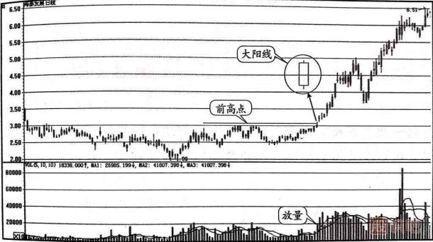 (1)在沖過前一個高點(diǎn)時應(yīng)放出較大的成交量,可以是單根的放量陽線,也可以延伸為放量的幾根陽線,總之,在突破前高點(diǎn)時要有放大的成交量配合。