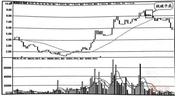 跌破平底是指股價(jià)經(jīng)過(guò)長(zhǎng)時(shí)間的大幅上漲(一般漲幅要求超過(guò)50%)后,寶塔線指標(biāo)在30周均線上方出現(xiàn)跌破平底,即最后一周的K線收盤價(jià)跌破了前周的收盤價(jià),如圖1-9所示。接下來(lái)由股識(shí)吧來(lái)探究寶塔線指標(biāo)跌破平底賣出,大伙兒一起看文章內(nèi)容。