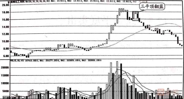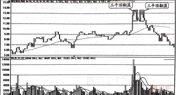 三平頂翻藍是指在周K線中,當股價經(jīng)過一段時間的上漲(一般漲幅要求超過50%)后,寶塔線在30周均線上方出現(xiàn)第一次或者第二次的三平頂翻藍,即在連續(xù)的三根周K線中,最后一周的收盤價向下跌破了第二周的收盤價,如圖1-7所示。接下來由股識吧來給妳說寶塔線指標三平頂翻藍賣出,由小編來為大伙兒剖析一下。