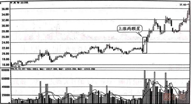 上漲兩顆星屬于常見的上漲中繼形態(tài),一般出現(xiàn)在大行情的初期。 大陽線之后連續(xù)出現(xiàn)勢(shì)均力敵的信號(hào)意味著多空雙方的力量在新的條件下取得了平衡,空方?jīng)]有打壓股價(jià)的力量,多方的勝利被鞏固了,投資者對(duì)股價(jià)的上漲已經(jīng)取得了共識(shí),大陽線取得的成果已經(jīng)得到市場(chǎng)的認(rèn)同,這往往是股價(jià)大幅度攀升的先兆。
