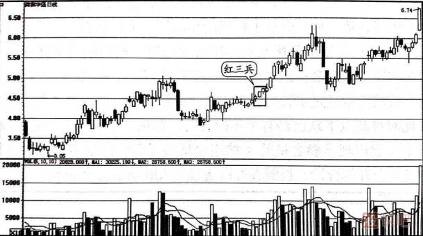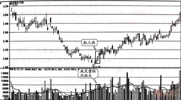 紅三兵由三根連續(xù)上漲的實(shí)體相當(dāng)?shù)?a href=http://www.jctcp6.com/GPRM/sy/1996.html target=_blank class=infotextkey>陽線組成,這三根陽線的收盤價(jià)一個(gè)比一個(gè)高,如圖1-17所示。接下來由股識吧來闡述多根K線紅三兵買入,還請大伙兒暢所欲言。