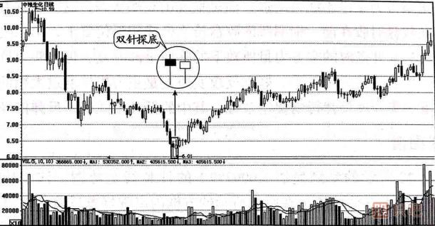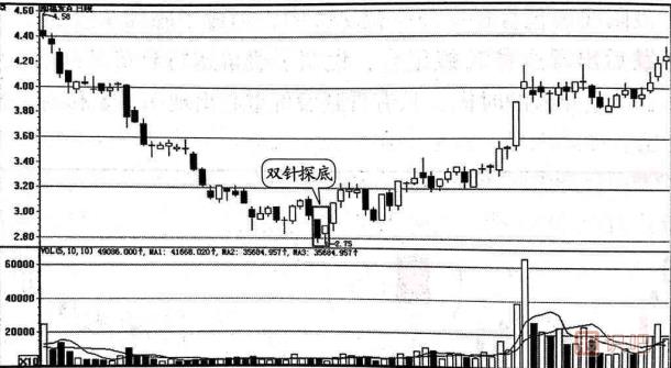 (1)雙針探底中的雙針,可以是緊密相連的兩根長下影線,也可以是中間隔有幾條K線的雙針走勢,但相隔的天數(shù)不能多于五個交易日。