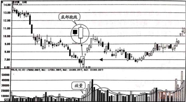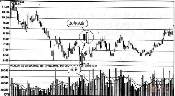 如圖1-2所示的是華夏銀行(600015)的日k線走勢(shì)圖。 該股從前期的高點(diǎn)11.34元開始下跌,在圖中所示的方框內(nèi)第一根K線處收出一根幾乎光頭光腳的中陰線,第二天收出一根幾乎是光頭光腳的大陽(yáng)線,將第一天的中陰線完全吞沒(méi),從而形成了抱線的K線組合。 仔細(xì)分析這兩根K線,可以發(fā)現(xiàn),首先,這個(gè)抱線出現(xiàn)在股價(jià)的大幅下跌50%之后,然后,中陰線和大陽(yáng)線的實(shí)體的長(zhǎng)度相差雖然不是非常懸殊,但是第二根大陽(yáng)線處的成交量已經(jīng)開始放大。 綜合分析可以得出多方主力已經(jīng)開始發(fā)動(dòng)行情的結(jié)論,所以,投資者應(yīng)及時(shí)買入股票,后面會(huì)有一輪上升行情。