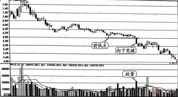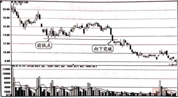 投資者在使用前低跌破賣出方法時,除了要注意和跌破整理賣出相同的要點以外,還要注意:在跌破前一個低點時可以是單根的中、大陰線,也可以延伸為幾根陰線。