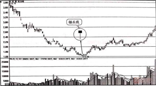 如圖1-10所示的是深賽格(000058)的日k線走勢圖。該股從前期的高點3.78元快速下跌至1.58元,當天收出一根下影線較長的錘頭陰線,并且成交量有微幅的放大,說明在此位置下檔支撐強勁,有多頭開始在逐漸地買入,表明后市上漲的概率較大。 此時投資者還不能立即買入,還要觀察后面股價的走勢。隨后股價重心不斷上移,說明股價回升的態(tài)勢已經(jīng)形成,這時才是投資者適量分批介入的時機。