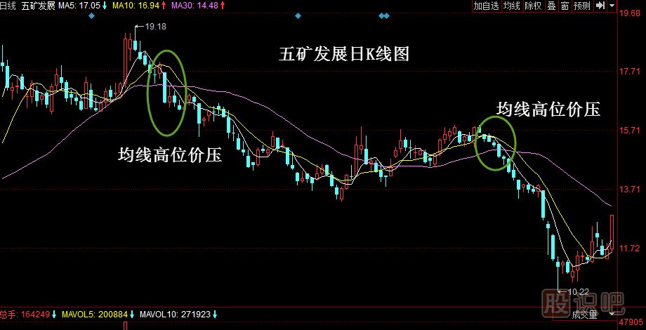 均線賣(mài)出形態(tài):均線高位價(jià)壓實(shí)例:五礦發(fā)展股價(jià)經(jīng)過(guò)一波反彈后見(jiàn)頂逐漸下跌,隨后5日均線、10日均線和30日均線在頂部形成了均線高位價(jià)壓形態(tài),說(shuō)明均線由多...
