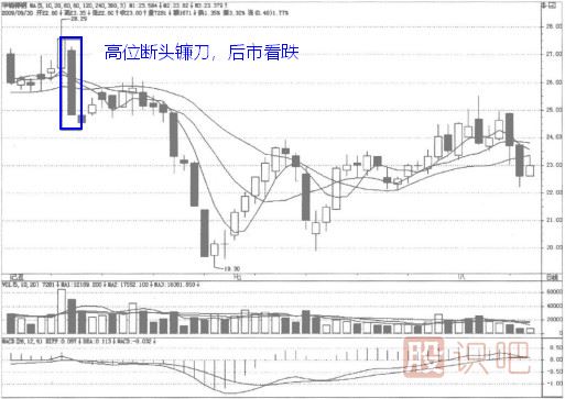 斷頭鐮刀斷頭鐮刀圖形特征由1根K線和3根移動(dòng)平均線組成,大陰線向下穿過(guò)3根平均線,收盤(pán)價(jià)低于這3根平均線。實(shí)戰(zhàn)含義高位斷頭鐮刀,后市...