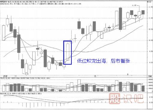 蛟龍出海蛟龍出海圖形特征由1根K線和3根移動(dòng)平均線組成,大陽(yáng)線向上穿過(guò)3根平均線,收盤(pán)價(jià)高于這3根平均線。實(shí)戰(zhàn)含義低位蛟龍出海,后市...