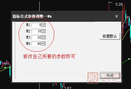 首先,鼠標(biāo)左鍵雙擊K線走勢圖,屏幕出現(xiàn)十字線。 然后,鼠標(biāo)右鍵點(diǎn)擊看盤軟件左上方所顯示的MA參數(shù)(如圖所示)