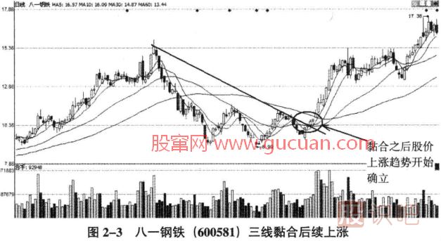 如圖2一3所示,八一鋼鐵日K線中的三線黏合之后,股價(jià)放量上漲一舉突破前期的阻力線。下跌中的股票,三線黏合的作用是對(duì)過(guò)度的下跌進(jìn)行調(diào)整,當(dāng)然也有為股價(jià)上漲蓄勢(shì)的意味,但是股價(jià)能否真正上漲,就要看后市中能否有效放量了。只有放量突破阻力之后,上漲的趨勢(shì)才真正地確立。