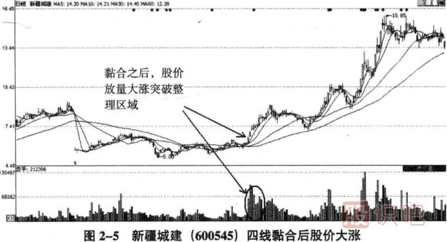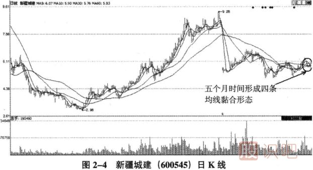 如圖2一4所示,從新疆城建的日K線圖中可以看出,該股在除權(quán)之后利用五個(gè)月的時(shí)間完成了四條均線的黏合。當(dāng)5日、10日、30日和60日均線完全黏合之后,股價(jià)進(jìn)一步確立運(yùn)行方向就顯得有必要了,畢竟五個(gè)多月的調(diào)整時(shí)間已經(jīng)不短了。五個(gè)月的蓄勢(shì)完成了均線粘合,一旦股價(jià)放量突破就會(huì)有驚人的漲幅。