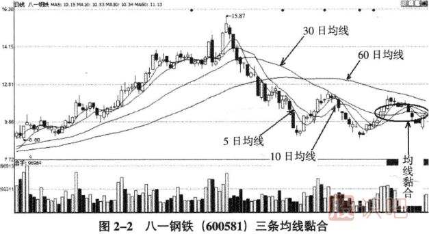 如圖2一2所示,在八一鋼鐵的日k線中,股價(jià)于15.87元/股見(jiàn)頂回落之后,在下跌趨勢(shì)中反復(fù)震蕩,最后形成了5日、10日、30日均線黏合形態(tài)。黏合的過(guò)程顯然是5日與10日均線首先黏合,然后兩條均線再與30日均線黏合。5日均線與10日均線黏合之后,股價(jià)的上漲幅度非常小,只是短時(shí)間的反彈而已。而三條均線都形成了黏合之后,后市會(huì)怎么樣呢?