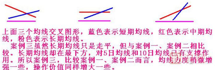 例:5日均線上穿10日均線的三種交叉走勢(shì):