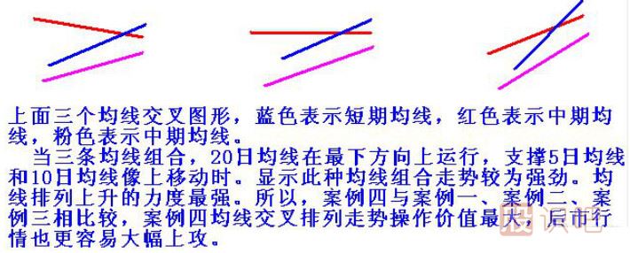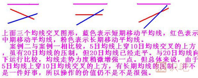 如果在兩條均線交叉的基礎(chǔ)上在加上一條輔助均線觀察,三條均線可以組合變化出更多不同的交叉形態(tài),交叉的強(qiáng)弱力度也會(huì)一目了然。