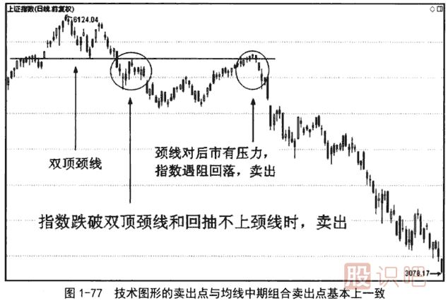 圖1-77是與圖1-76同一時(shí)間段的日線圖。在圖1-76中,跌破60日均線的大陰線同時(shí)也跌破了雙頂?shù)念i線。雙頂是轉(zhuǎn)勢(shì)技術(shù)圖形,有效跌破頸線應(yīng)賣出。跌破雙頂頸線后又回抽了一下頸線,回抽頸線不上,應(yīng)當(dāng)繼續(xù)賣出。