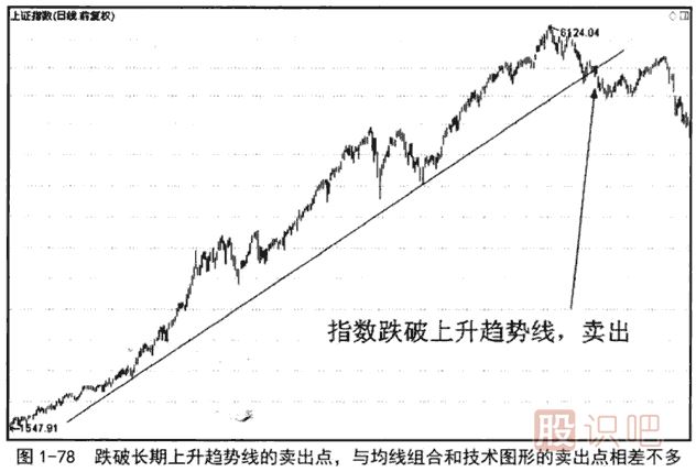跌破長(zhǎng)期上升趨勢(shì)線,雖然不能確定大盤由牛走熊,但即使繼續(xù)上漲,指數(shù)也一定不會(huì)再沿著原有的上升角度向上運(yùn)行了,至多會(huì)以更緩的角度上漲。股價(jià)或指數(shù)跌破長(zhǎng)期上升趨勢(shì)線后,無(wú)論是長(zhǎng)線交易者還是中短線交易者,都應(yīng)該清倉(cāng)離場(chǎng),退出觀察。