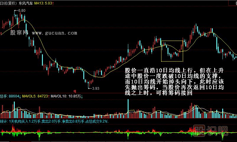 在上升趨勢中,股價回調(diào)時往往是一次不錯的買入機會。當(dāng)上升趨勢形成后,10日均線雖然是強支撐線,但莊家有時出于種種目的,常常會將一些重要的支撐位擊穿,盤面上會出現(xiàn)一些頭部的特征,將一些對技術(shù)一知半解的投資者或是追求短線收益的操作者清理出局,然后再快速拉升股價,讓前期賣出的投資者或場外觀望的投資者再追漲買入。在上升趨勢中主力常常利用這種方法做騙線,引誘投資者上當(dāng)。對此投資者可在股價重回10日均線之上時再次買入。為回避風(fēng)險或保存利潤,當(dāng)股價跌破10日均線時賣出后,如股價在短期內(nèi)又回升至10日均線上方且10日均線仍繼續(xù)上行,應(yīng)再次買入甚至要追漲買入以防踏空,因為莊家洗盤的目的正是為了日后大幅拉升,上升行情仍將繼續(xù)。