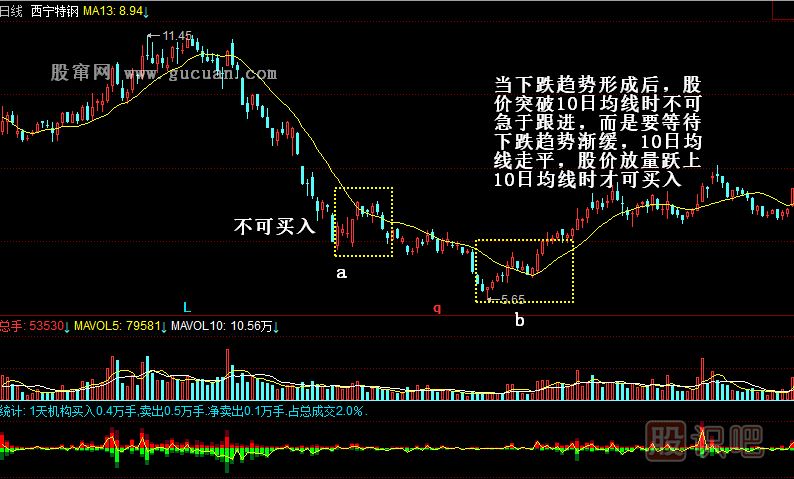 所以說10日均線成為我們判斷大盤或個股短線趨勢的一個重要的參考指標(biāo),也就是說當(dāng)股價在10日均線之上運行,并且10日均線向上移動時,就可確定股價在短期內(nèi)的趨勢是向上的,股價還會繼續(xù)上漲;而當(dāng)股價在10日均線之下運行,并且10日均線向下移動時,就可確定股價在短期內(nèi)趨勢是向下的,股價還是繼續(xù)下跌。在操作中,我們可以把10日均線作為買入的依據(jù),股價站上10日均線再買入,雖然此時離底部或與最低價相差一定價位,買入的價格相對會高一些,當(dāng)這時上升趨勢已經(jīng)確立,漲勢剛剛開始,此時買入是比較穩(wěn)妥的。
