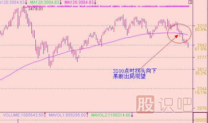 這個(gè)圖是最近A股上證走勢(shì)圖,3100點(diǎn)時(shí)拐頭開(kāi)始向下,此時(shí)投資者必須果斷出局,這是基于趨勢(shì)線的指導(dǎo)作用所做的決定。從此處看大盤(pán)后市還有下挫空間,投資者不可盲目抄底。那什么時(shí)候可以去跟進(jìn)抄底,我們下面將要詳細(xì)講述。