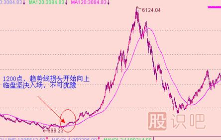 趨勢(shì)線就是通常所說(shuō)的120日均線,俗稱半年線,有的人也稱之為牛熊線。這里我們所說(shuō)的趨勢(shì)線可用于分時(shí)、日線、周線、月線,但如果不特別強(qiáng)調(diào)就僅指日線。趨勢(shì)線是股市中長(zhǎng)期走勢(shì)的風(fēng)向標(biāo),是絕大多數(shù)主力、莊家進(jìn)退的依據(jù),在實(shí)盤(pán)操作中對(duì)我們有巨大的指導(dǎo)意義。
