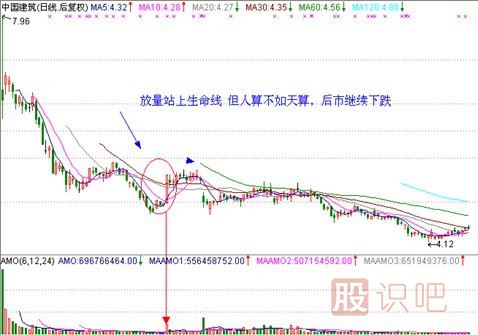 601668,中國建筑,2009年10月14日,股價(jià)也是放量站上生命線,但很可惜,后期中國建筑沒有發(fā)動(dòng)上漲行情,后來證明這僅是下跌途中的一次反彈。問題出在哪里?當(dāng)時(shí)中國建筑上市因大盤不好,這個(gè)倒霉孩子上市當(dāng)日就破發(fā),上市后繼續(xù)下跌,股價(jià)在跌至4.8元附近,攻擊線和操盤線也已經(jīng)走平開始向上,當(dāng)時(shí)的游資或者說敢死隊(duì)以為股價(jià)見底,悍然發(fā)動(dòng)了突襲,股價(jià)2009年10月14日直封漲停,但中國建筑是個(gè)基金重倉股,很明顯游資的所為讓基金感覺到了股價(jià)的異動(dòng),隨后幾日并未配合游資拉升,當(dāng)時(shí)游資選擇中國建筑也有失策的地方,這個(gè)股票盤子太久,啟動(dòng)資金需要的太多,后市我估計(jì)明顯是游資資金鏈斷裂再也無力拉升,而資金則是通過繼續(xù)大幅殺跌把游資絞殺了。