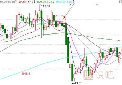 這是最近上證A股的日線圖,2009年12月17日和2010年1月20日兩次均線最佳賣點(diǎn),都是巨陰線如斷頭鍘刀般把均線拐頭砸向下方,短線跌幅500點(diǎn)左右,對(duì)個(gè)股來說跌幅絕對(duì)巨大,早一點(diǎn)識(shí)別風(fēng)險(xiǎn)可以避免不少損失。
