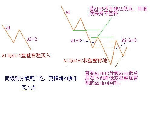 上節(jié)中的“Ai與Ai+2之間盤整背馳”,將演化出“當(dāng)i為偶Ai+3跌破Ai高點(diǎn)”或“i為奇數(shù)Ai+3升破Ai低點(diǎn)”;因而相應(yīng)演化出高一級(jí)別的中樞,例如在該例子里,Ai+1、Ai+2、Ai+3就是30分鐘的中樞,而所有更大的中樞,當(dāng)然是先有高一級(jí)別才可能有,否則連30分鐘的中樞都沒有,哪里來日、周、月的?但這個(gè)現(xiàn)象就保證了,在同級(jí)別分解下,一個(gè)小級(jí)別的操作是可以按一個(gè)自動(dòng)模式換檔成一個(gè)高級(jí)別的操作。