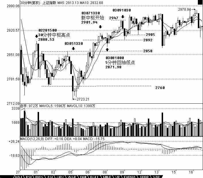 勢重新組合,使得走勢更加清晰。很多人一看走勢就暈,最主要是不了解走勢連接的結(jié)合性,任何的走勢,在結(jié)合律上,都可以重新組合,使得走勢顯示明顯的規(guī)律性。假設(shè)A+B+C+D+E+F,A、C、E是5分鐘級別的,B、D、F是30分鐘級別的,其中還有延伸等復(fù)雜情況。這時候,就可以把這些走勢按5分鐘級別重新分解,然后按中樞的定義重新組合走勢,按結(jié)合律的方法,把原來的分解變成A`+B`+C`+D`+E`+F`,使得A`、B`、C`、D`、E`都是標(biāo)準(zhǔn)的只是30分鐘級別,而最后的F`變成在30分鐘意義上未完成的走勢,這樣進行分析,就會很明晰了。當(dāng)然,具體的組合有很多可能,如何根據(jù)當(dāng)下的走勢選擇一種最有利指導(dǎo)操作的,就是考功夫的事情。而這種根據(jù)結(jié)合律的最佳組合,是根據(jù)市場當(dāng)下的走勢隨時變化的,而所有的變化,都符合理論要求且不會影響實際操作,是對實際操作起著更有力的幫助。例如,在最近走勢中,30分鐘圖上,2760到2858這30分鐘中樞,03081000的5分鐘回抽確認了一個第三類買點,然后其后就繼續(xù)走出一個新的30分鐘中樞,而030810005分鐘回抽低點2871點比上一中樞的最高點2888點要低,而后來關(guān)于03071330開始的這個30分鐘中樞出現(xiàn)延伸,這樣,我們就可以對這個分解進行重新組合,給出一個更清晰的組合方法,把03081000的5分鐘回抽組合到03051330開始的這段5分鐘走勢中,形成一個5分鐘的上漲,然后新的30分鐘中樞就從03091030,這樣的好處在于,這個中樞震蕩的低點2892點比2888點高,如果其后的震蕩不出現(xiàn)跌破2888的走勢,那么就是一個30分鐘的上漲走勢形成了。但在這個新的中樞被一個新的第三類買點有效突破前,依然存在震蕩跌破2888點甚至最終確認中樞擴展。但這樣的重新組合,對看圖就有了幫助。當(dāng)然,站在純中樞的角度,依然可以堅持讓新中樞從03071330開始,這樣對具體的操作也沒有太大影響,但在判斷上就沒有重新組合的看起來方便了。