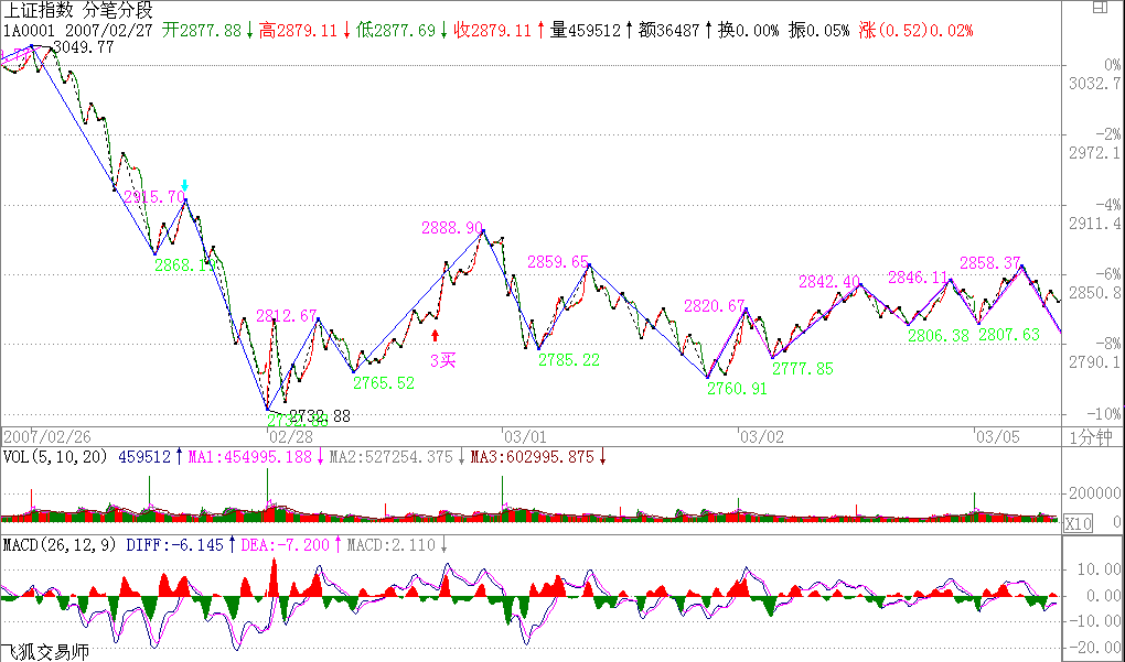 由于相應(yīng)的a+A+b是一個(gè)1分鐘的走勢(shì),那天故意提早開盤前發(fā)帖子,等于是現(xiàn)場(chǎng)直播B的形成,但1分鐘的走勢(shì),估計(jì)能看到或保留的不多,那就用15分鐘圖來代替。02270945到02280945,剛好4小時(shí),構(gòu)成a+A+b,其中的A,在15分鐘圖上看不清楚,在1分鐘圖上是02271306到02271337,中樞的區(qū)間是2877到2894點(diǎn),中樞波動(dòng)的高點(diǎn)也就是b的起跌點(diǎn)是2915點(diǎn)。c段大致從02281100算起,這個(gè)c要反轉(zhuǎn)成功,在相同級(jí)別內(nèi)至少要表現(xiàn)出比b的力度不能小,這可以從MACD來輔助分析,也可以從一個(gè)最直觀的位置來分析,就是必須能重新回來b的起跌點(diǎn),這就如同向天上拋球,力度大的如果還拋不高,那怎么能算力度大?至于c能不能回到b的起跌點(diǎn),那可以分析c內(nèi)部的小級(jí)別,如果c出現(xiàn)頂背馳時(shí)還達(dá)不到該位置,那自然達(dá)不到了,所以這種分析都是當(dāng)下的,不需要預(yù)測(cè)什么。有人問為什么要看2915點(diǎn),道理就是這個(gè)。至于還讓大家看5日線,只是怕大家看不懂的一個(gè)輔助辦法,有了這么精確分析,所有的均線其實(shí)都沒什么意義了。而c的力度不夠,那就自然要回到B里,所以后面的走勢(shì)就是極為自然的。站在這個(gè)角度,2888點(diǎn)的第一賣點(diǎn)沒走,那么03011100的2859點(diǎn)也該走了,那也可以看成是對(duì)B的再次離開,這力度顯然更小,當(dāng)然要走了等回跌以后看情況再回補(bǔ),而后面又出現(xiàn)了100點(diǎn)的回跌,然后出現(xiàn)底背馳,當(dāng)然就是一個(gè)完美的回補(bǔ)點(diǎn)了。