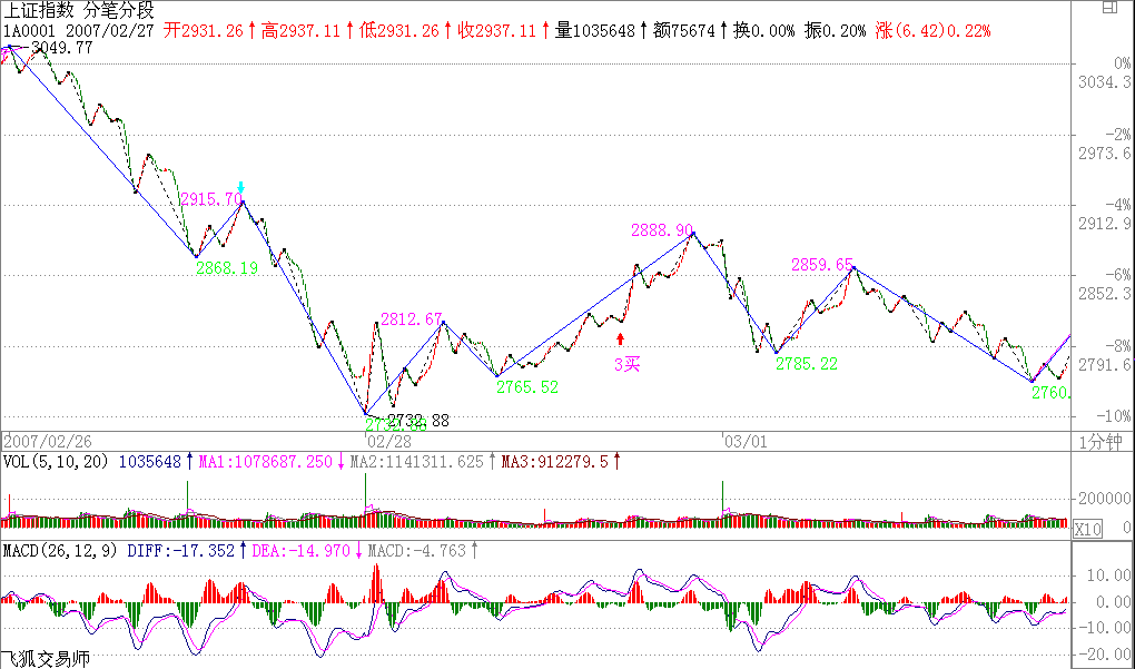 昨天下午的是1分鐘級別的上漲,昨天收盤前是一個1分鐘以下級別的頂背馳,今天早上1006附近是一個1分鐘以下級別的底背馳,然后出現(xiàn)一個大的中樞,上下震蕩,收盤勉強拉回這個中樞。明天,如果大盤在這中樞下出現(xiàn)第三類賣點,那大盤就會繼續(xù)探下去。否則依然圍繞這中樞震蕩。