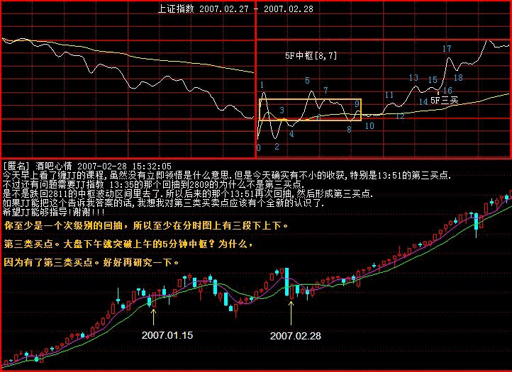 詳細(xì)說,在上面例子30分鐘的a+A+b+B+c里,A是已出現(xiàn)的,是一個30分鐘的中樞,這可以用定義嚴(yán)格判別,沒有任何含糊、預(yù)測的地方。而b段一定不可以出現(xiàn)30分鐘的中樞,也就是只能最多是5分鐘級別的。如果b段一個5分鐘級別的開始上漲已經(jīng)使得30分鐘的圖表中不可能出現(xiàn)背馳的情況,那么你就可以有足夠的時間去等待走勢的延伸,等待他形成一個5分鐘的中樞,一直到5分鐘的走勢出現(xiàn)背馳,這樣就意味著B要出現(xiàn)了,一個30分鐘的新中樞要出現(xiàn)了。是否走,這和你的資金操作有關(guān)了,如果你喜歡短線,你可以走一點,等這個中樞的第一段出現(xiàn)后,回補,第二段高點看5分鐘或1分鐘的背弛出去,第三段下來再回補,然后就看這個中樞能否繼續(xù)向上突破走出c段。注意,c段并不是天經(jīng)地義一定要有的,就像a也不是天經(jīng)地義一定要有的。要出現(xiàn)c段,如同要出現(xiàn)b段,都必須有一個針對30分鐘的第三類買點出現(xiàn),這樣才會有。所以,你的操作就很簡單了,每次,5分鐘的向上離開中樞后,一旦背馳,就要出來,然后如果一個5分鐘級別的回拉不回到中樞里,