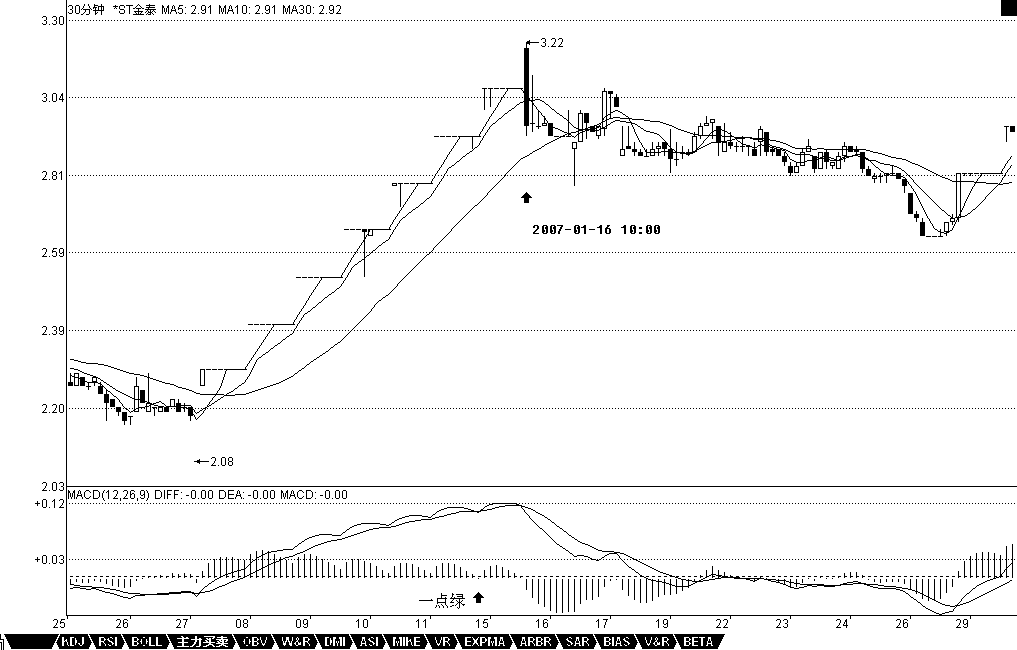還有一種,就是股票不斷一字漲停,這時候,由于MACD設計的弱點,在1分鐘、甚至5分鐘上,都會出現(xiàn)一波一波類似正弦波動的走勢,這時候不能用背弛來看,最簡單,就是用1分鐘的中樞來看,只要中樞不斷上移,就可以不管。直到中樞上移結束,就意味著進入一個較大的調整,然后再根據(jù)大一點級別的走勢來判斷這種調整是否值得參與。如果用MACD配合判斷,就用長一點時間的,例如看30分鐘。一般來說,這種走勢,其紅柱子都會表現(xiàn)出這樣一種情況,就是紅柱子回跌的低點越來越低,最后觸及0軸,甚至稍微跌破,然后再次放紅伸長,這時候就是警告信號,如果這時候在大級別上剛好碰到阻力位,一但漲停封不住,出現(xiàn)大幅度的震蕩就很自然了。例如600385,在2。92那漲停,MACD出現(xiàn)一點的綠柱子,然后繼續(xù)漲停,繼續(xù)紅柱子,而3。28元是前期的日線高位,結果3。22漲停一沒封住,就開始大幅度的震蕩。